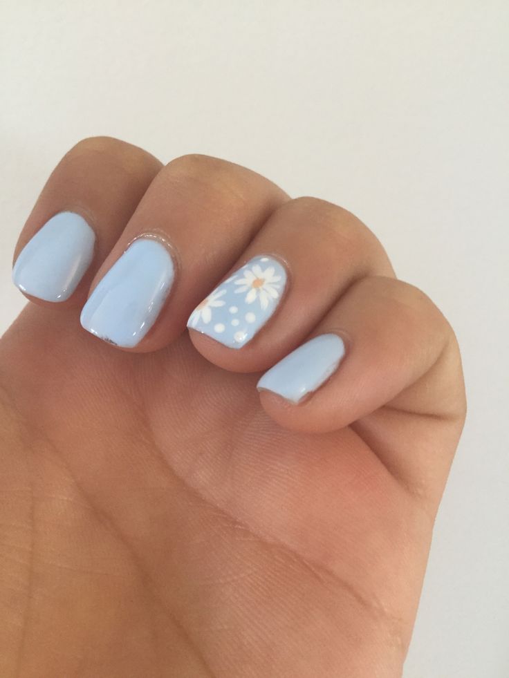Soft blue nail design features a delicate combination of pastel shades. The gentle hue is accented by a charming floral pattern on one nail, showcasing a white daisy with surrounding dots. This design embodies a fresh, cheerful aesthetic, perfect for a light and playful look. Source