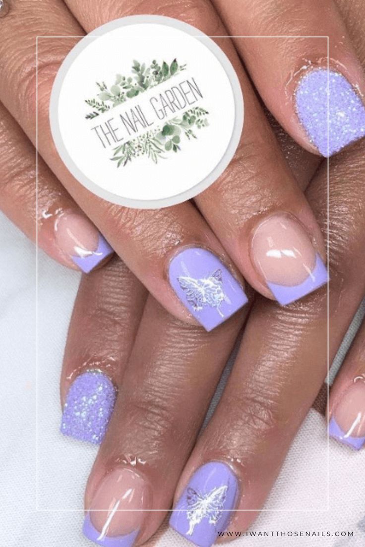 Trendy nail design featuring a harmonious blend of pastel shades and sparkling accents. Soft lavender and crisp white create a fresh backdrop, while the addition of glitter adds a touch of glamour. This chic combination is perfect for a stylish, polished look that balances elegance and playfulness. Source