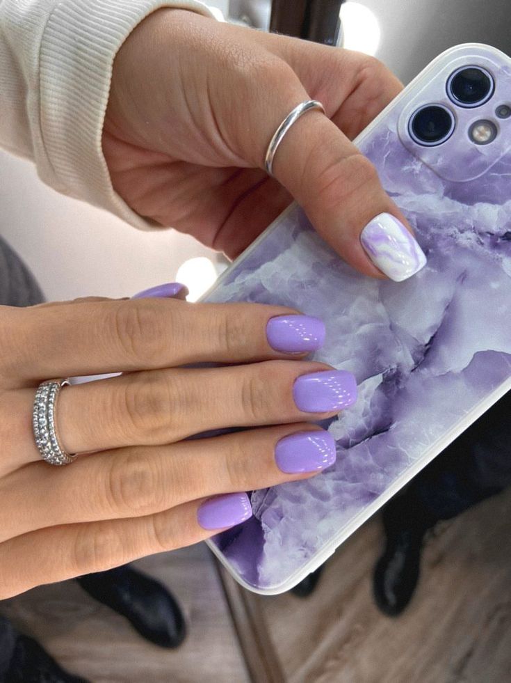 Lavender-inspired nail design featuring a mix of solid and marbled patterns. The combination of glossy and textured finishes adds depth and sophistication, creating a stylish and modern look. This design pairs beautifully with the lavender phone case, enhancing the overall aesthetic. Source