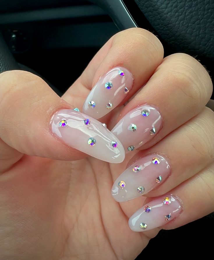 Elegant nail design featuring a soft, milky base with a glossy finish. Sparkling rhinestones of various sizes are artfully placed across the nails, creating a dazzling effect that catches the light beautifully. This sophisticated look combines simplicity with glamour, perfect for any occasion. Source