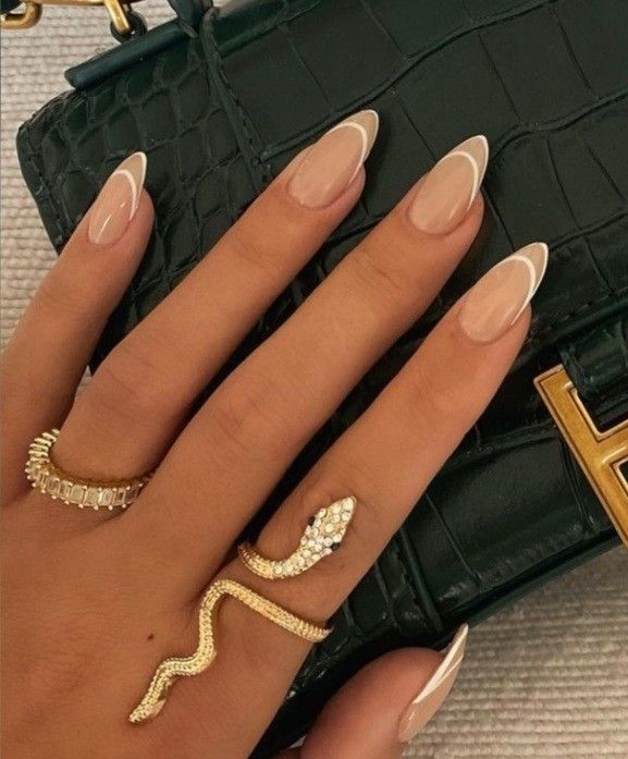 Elegant almond-shaped nails. A subtle nude base with crisp white tips adds a chic and timeless flair. Complemented by bold gold rings, this design exudes sophistication and style. Source